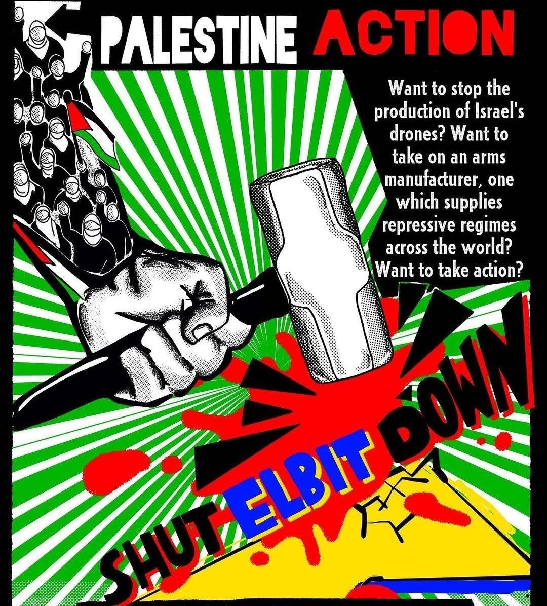 I. Let’s state the obvious first: the act of shaking off isn’t easy for there are many different types of chains. Liberation is always worth the effort, but for some more than others, it entails a great deal of pain. For Palestinians, even something simple, like keeping a grove of olive trees, at a moments notice, becomes a one sided fight. Even the humblest of farmers finds himself tormented by an entire host of opponents, day and night. Or else a journalist, whilst going about their work, might be shot down like an animal in the dirt, All the while, winks and nods and smirks hide in the occupiers' excuses. How do you stop these abuses? For them, whether in exile or apartheid, the catastrophe has distorted even the marrow of their memory. To understand how this came about, needs must we name the enemy. From when and where comes the Hydra’s head? It’s the usual story: from stolen land, empire, piles of the dead. Back several decades, in sixty-six, the rogue state still young our enemy, Elbit came to exist and quickly began climbing the rungs. They can make their myths about homelands, chosen peoples and their defence. But draw the two sides up together, it’s clear, for one, exile retains the present tense. Elbit was the next step: of domination from the river to the sea. Sure, Israel had killed with the usual tools but now they wanted flight technology. All that was on their minds was how to kill more effectively. Not content with burnt out villages dead fedayeen and mourning wives, Elbit helped the settler colony find new ways of taking lives. Developing the tech to help Israel fly help them more completely occupy Elbit set out to kill the beauty of the sky. Nowadays, a bright morning with no clouds, the sort of scene you’d usually like has a different sort of meaning there Like constant surveillance and air strikes. The terror in each sip and in each sup of borrowed seconds and air never stops You want to feel fear in Gaza? It’s simple: you just look up. Absent sight, you’d still hear that onomatopoeia occupying the corner of your ear: the sound of a drone. That buzzsaw whine which never leaves you alone, signifies oncoming brutality and the breaking of stone. A Palestinian could find a quiet side street a small nook free from soldiers But if there’s even an inch of sky above it they’ll always be looking over their shoulder. This isn’t to say, all the while Palestinians remain timid and docile For 75 years, forever under attack the people of Palestine have always fought back. To name a few, whether the PFLP, the PIJ or the Lions Den, the colonised inevitably take up the rifle again. Wherever invasion as a structure persists, the question of oppression has one answer: resist. II. Let’s recap: These parts of occupied life, and all the others, too many to list them. Are only possible with one thing, a war machine by the name of Elbit Systems. Each day, after the morning sun has risen Daylight shines upon an open air prison. Let’s ask again: how do you end this? Why wait for the next revolution of the dialectic? If we must find a solution let’s try something more kinetic. Try to advance the struggle and find a hammer and crowbar have their own poetics. From Jaffa to Haifa to the Golan hinterlands, Anyone who remains are God’s own splinters. Let’s follow their example and at the very least try To stick ourselves in the enemy’s eyes. Marches and petitions are not the right tools for militants. We must stop the enemy from operating even if just as irritants. Out of the present conditions, from it’s challenges, new possibilities beckoned Some questions arose like: ‘How much profit is lost exactly, if Capital stops for even a few seconds?’ Next questions: ‘How can we expand that gap?’ ‘Which tactics and tools are the most apt?’ Simple questions with simple answers, so obvious they seem elementary yet for ages they went unsaid, ‘cos of a withered imaginary. We need to make the arms dealers concede even if only by a fraction. What course is left to us? direct action. Strike a window, you strike at the core of an antagonism Stop the drones, and you start a schism. One part of the supply chains stops, it affects all the others like waves on waves on waves rippling out to a new kind of future one with less bombs and graves. A war against war, spanning back to the Mandatory. But now comrades are picking up tools, and shutting down the imperial laboratory. Interlude: [The colonisation of Palestine happening for over 50 years, the need to challenge war crimes surpassed my own fears. From an activist in Leicester 24th May the only way, direct action they can say what they want: we’re here to stay. It’s hard to tell whether the support we’ve received will work but through direct action, Apartheid finally fell.] III. Don’t get intimidated, and think you can’t match Pal Action at all. Everybody has to start somewhere, and the first step is often small. Hard to believe, in hindsight the first punch thrown in this fight, was just red paint on Elbit’s walls. A bit of hiccup, if barely then thrown out by the building security but whatever initial embarrassment, the first step was taken, the rubicon crossed and just so it’s clearly explained, where pride is lost, confidence is gained. Next step: hit them where it hurts, hit them where they do the work. Let’s not shirk from situating the fight, and talk about the 10 Elbit sites: In Leicester, there’s UAV Tactical Systems In Oldham, there’sFerrantiIn London, there’sKingsway(Both gone today, nobody will miss them) In Shenstone, there’s UAV Engines Limited (UEL) then on to Tamorth there’s Elite KL And in Sleaford there’s RAF Cranwell That’s seven so far on our tally, next there’s Holyhead with RAF Valley. This next one’s not so subtle, rather crystal clear, down here at Aztec West you have Elbit Bristol. Only two more to go, what does that leave? Next at Grantham is RAF Barkston Hea